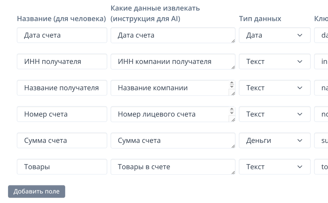 Легко настроить извлечение данных из любого документа. Укажите название поля, подробную инструкцию для AI, тип данных (текст, дата, число) и при необходимости ключ JSON. Система сама создаст оптимальные настройки.