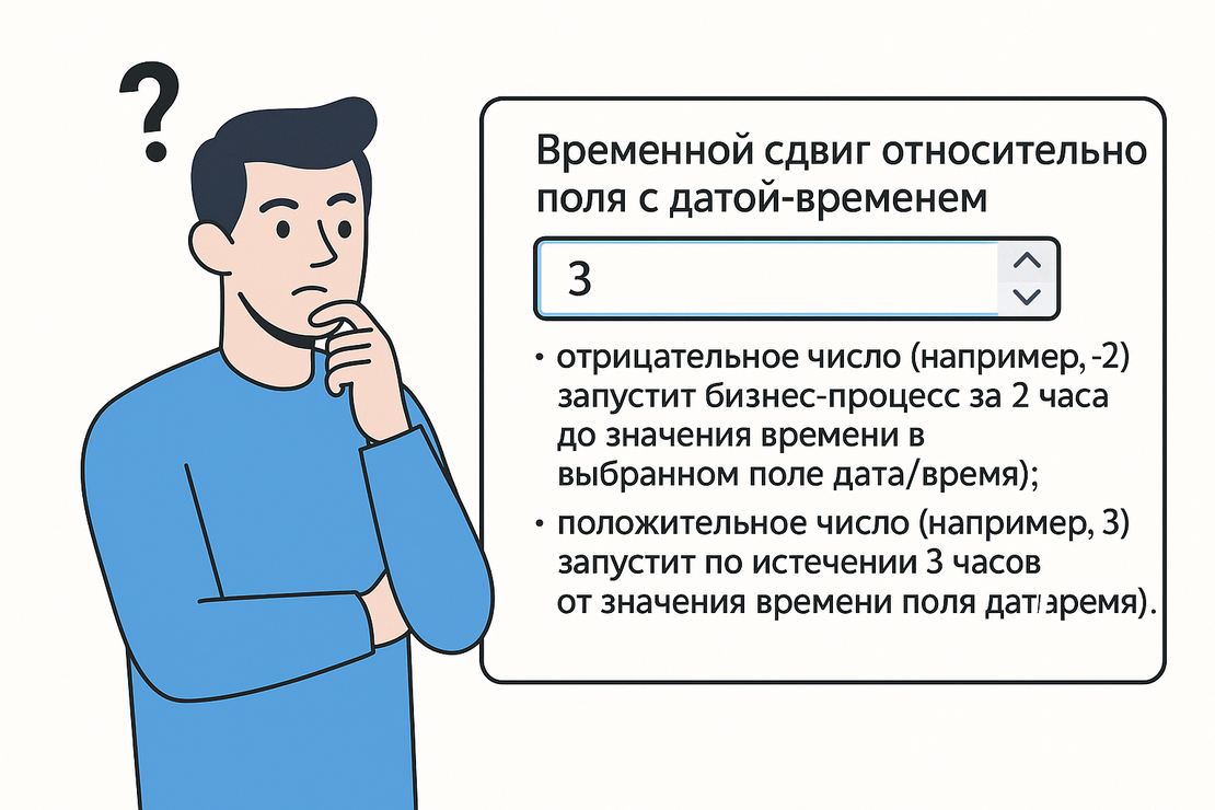 - отрицательное число (например, -2) запустит бизнес-процесс за 2 часа до значения времени в выбранном поле дата/время);
